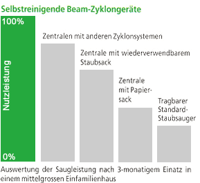 Die Saugkraft der Zentraleinheit ist bedeutend grösser als die eines mobilen Staubsaugers, da Beam die einzigartige Zyklontechnologie ohne Staubsack und mit selbstreinigenden Filtern einsetzt. Die Saugwirkung geht tiefer und wird durch die Staubmenge im Sammelbehälter nicht beeinträchtigt.